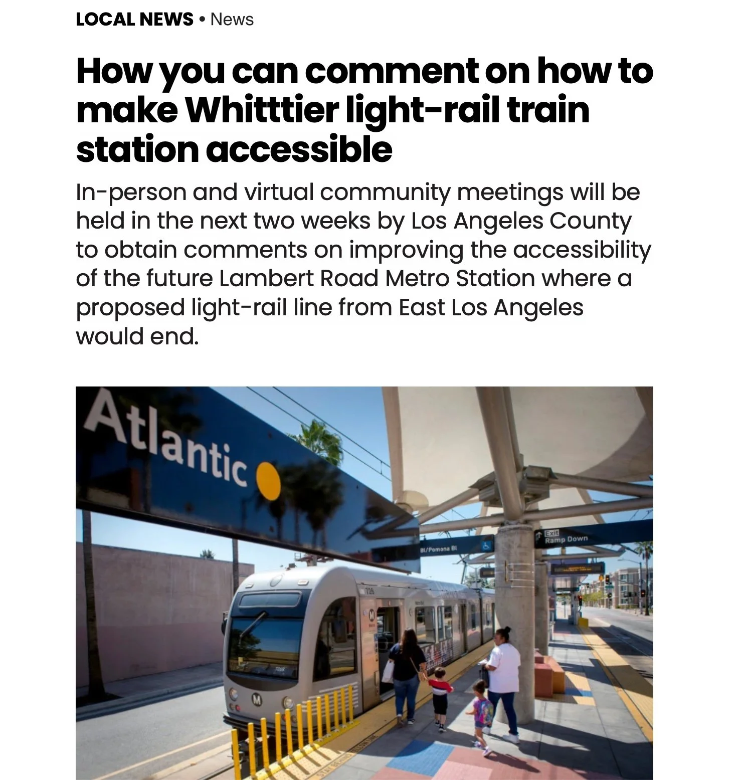 In October, the KPA team partnered with KOA on walk audits for the Lambert Road Metro Rail Station First-Last Mile Plan. Los Angeles County, with support from Supervisorial District 4 and the City of Whittier, is working on a project to improve accessibility around the future Lambert Road Metro Rail Station where a proposed light rail from East Los Angeles will eventually end.
